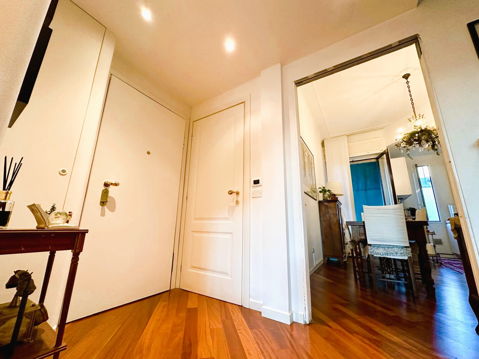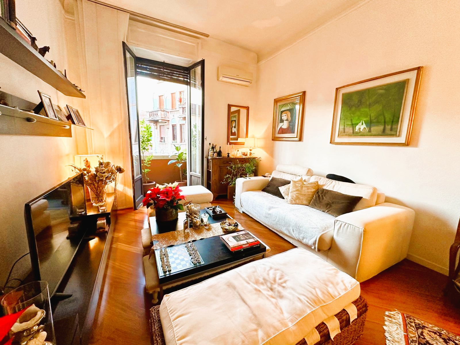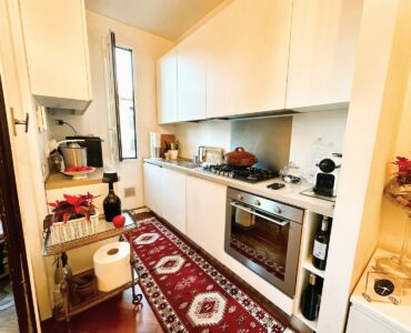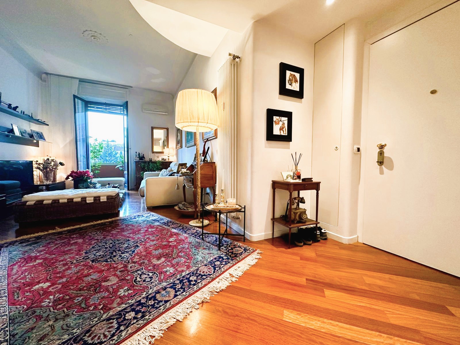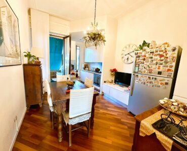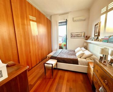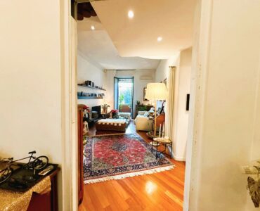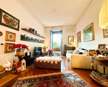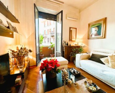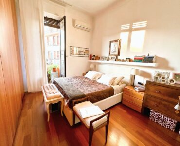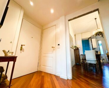 L’appartamento è composto da due ingressi, soggiorno, ampia cucina abitabile, 2 camere, doppi servizi, ripostiglio e 4 balconi; completa la proprietà un solaio di pertinenza. L’immobile presenta pavimenti in parquet ovunque tipo “doussiè”, porte interne in legno, infissi esterni originali in legno in buono stato manutentivo. Il riscaldamento è centralizzato a radiatori – con termovalvole e contabilizzatori per il consumo – tramite teleriscaldamento.