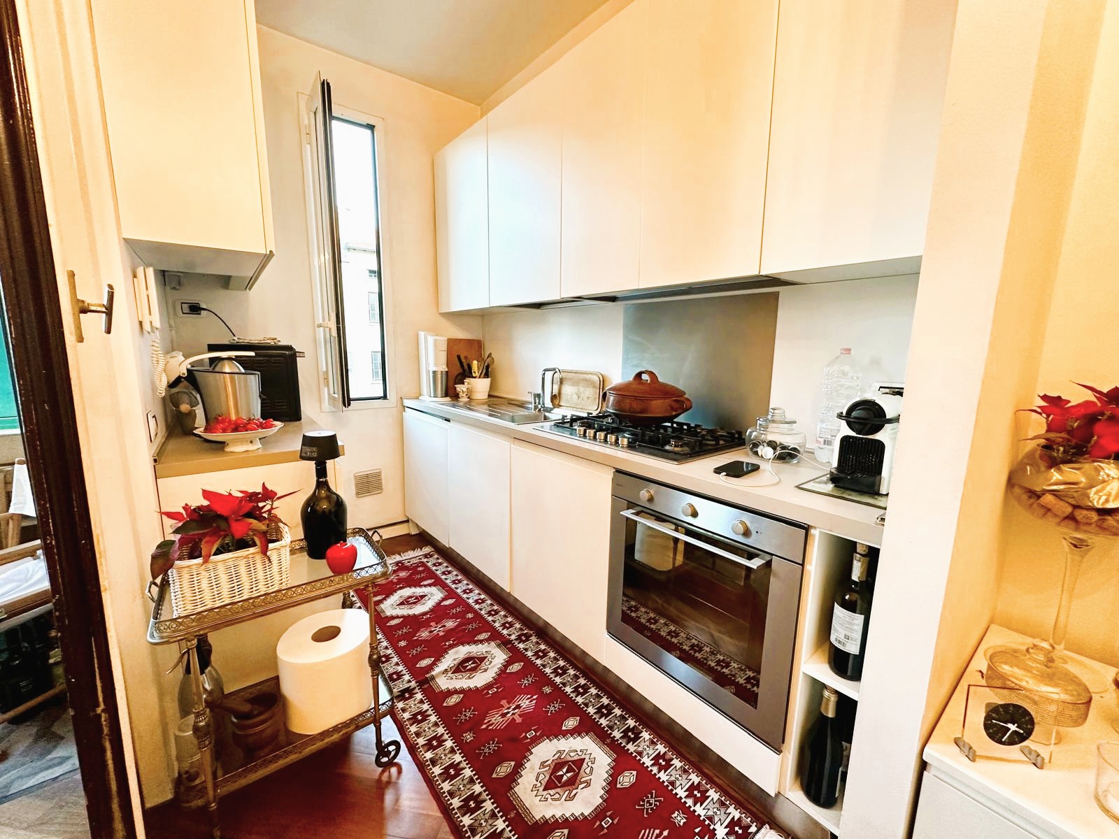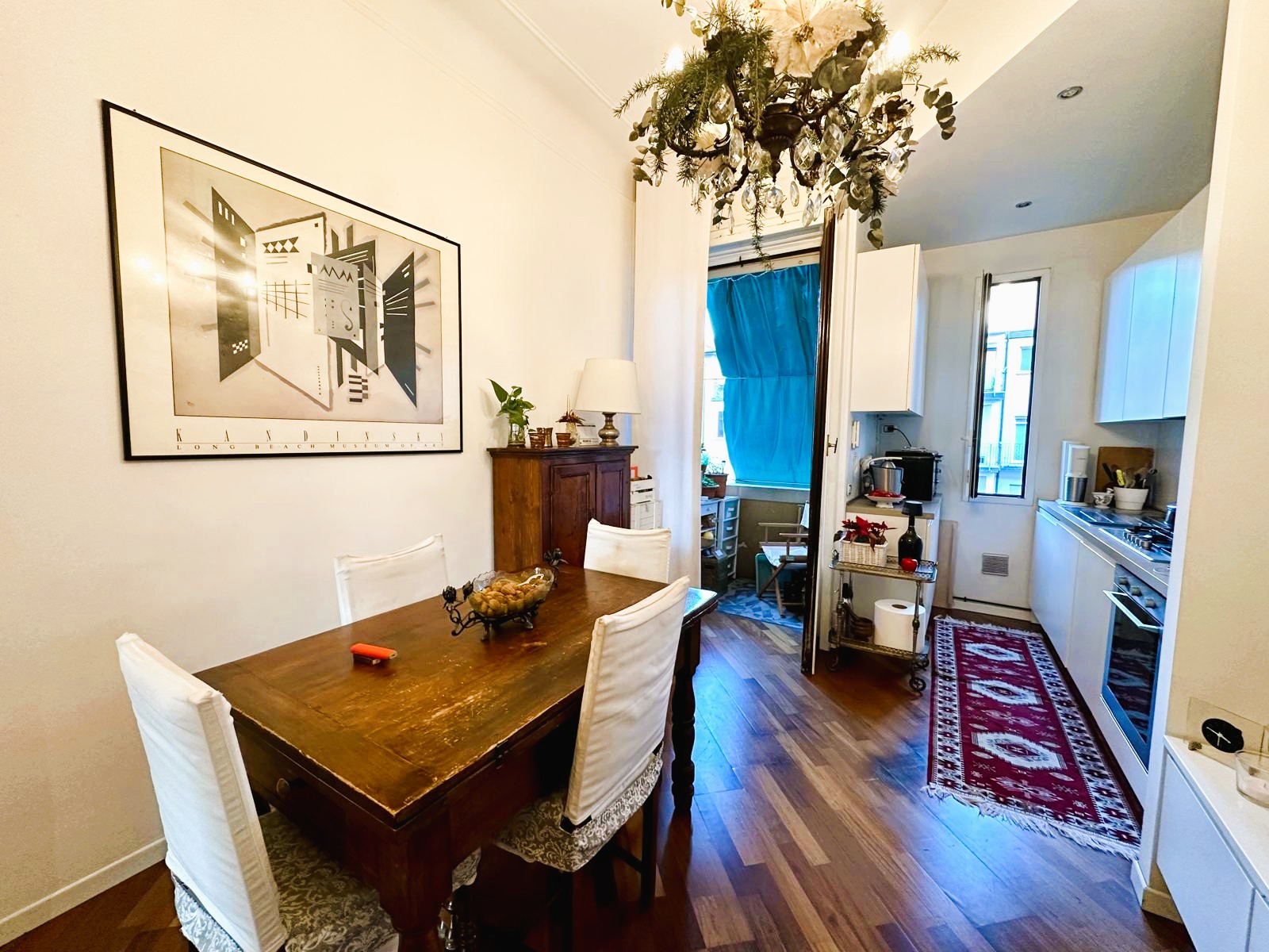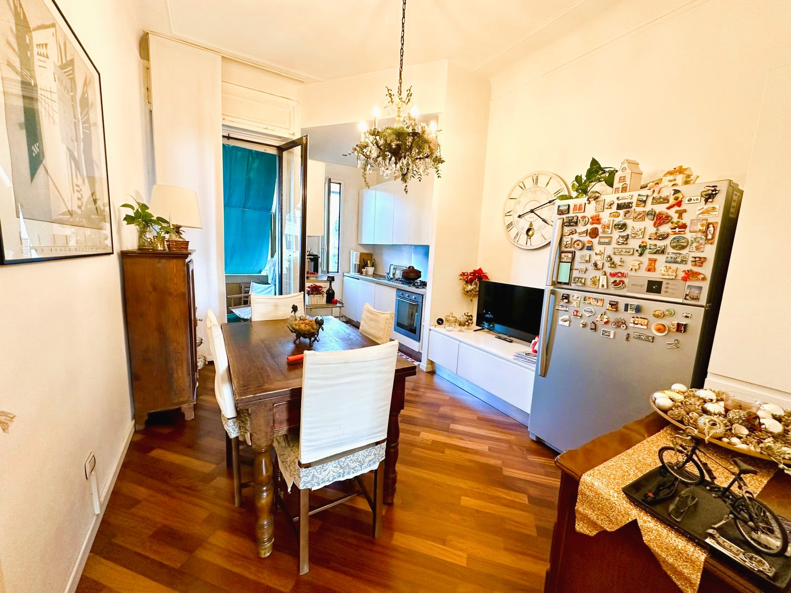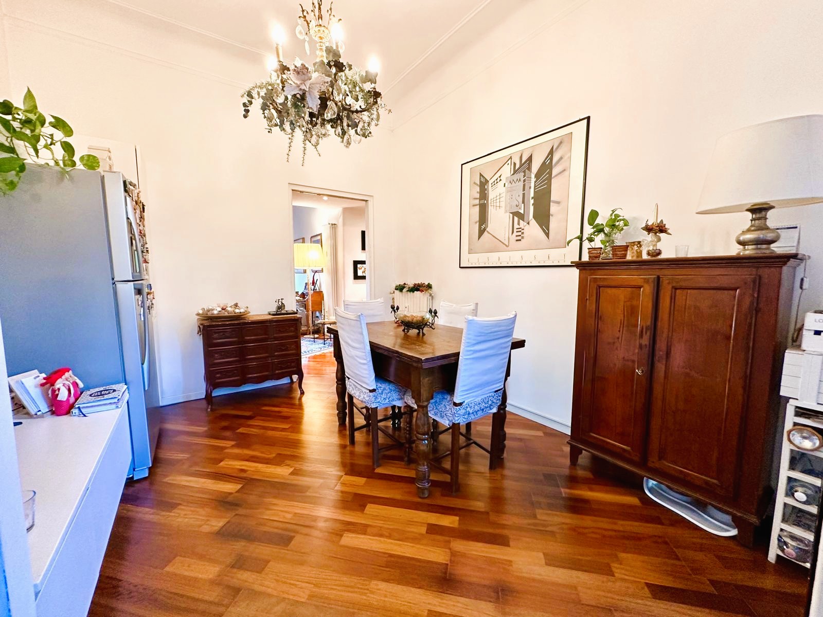 L’appartamento è composto da due ingressi, soggiorno, ampia cucina abitabile, 2 camere, doppi servizi, ripostiglio e 4 balconi; completa la proprietà un solaio di pertinenza. L’immobile presenta pavimenti in parquet ovunque tipo “doussiè”, porte interne in legno, infissi esterni originali in legno in buono stato manutentivo. Il riscaldamento è centralizzato a radiatori – con termovalvole e contabilizzatori per il consumo – tramite teleriscaldamento.